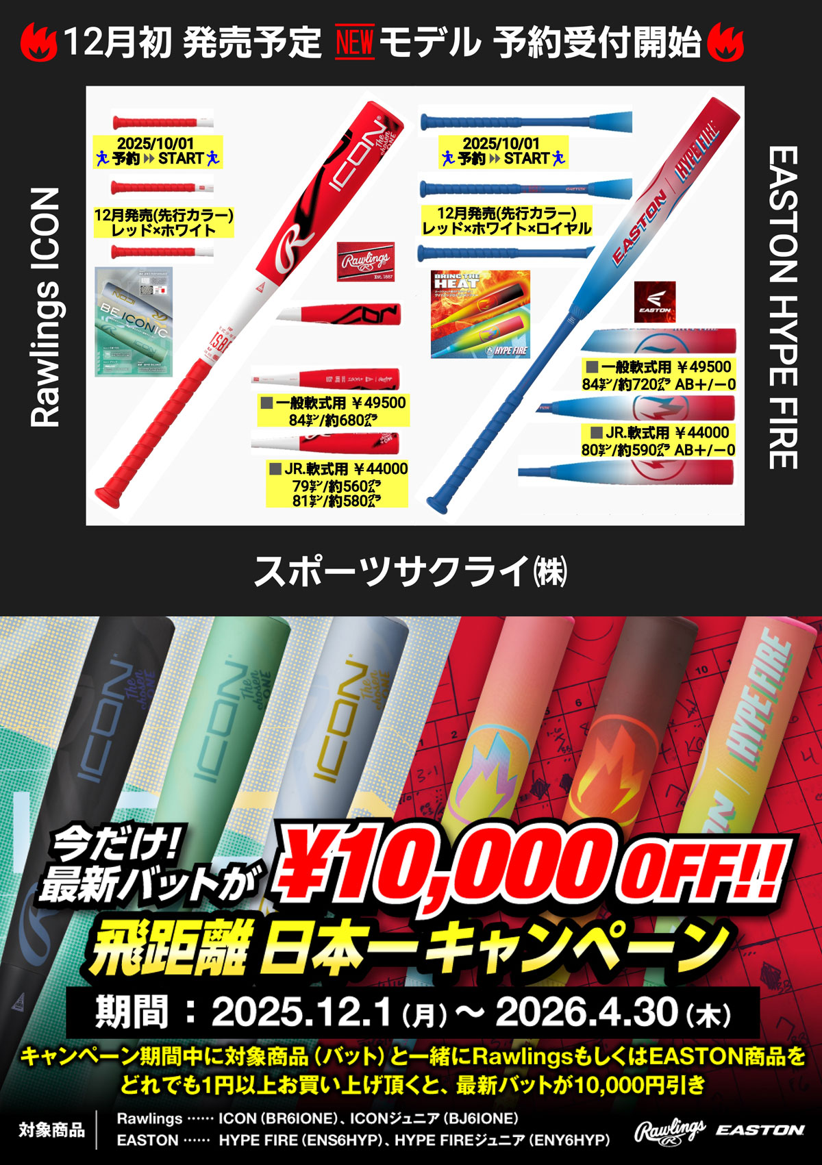 《野球》予約受付中! 「ローリングス・イーストン」NEWモデル登場! 予約時にバットとローリングス/イーストン商品1点購入で バットが10,000円引きに!