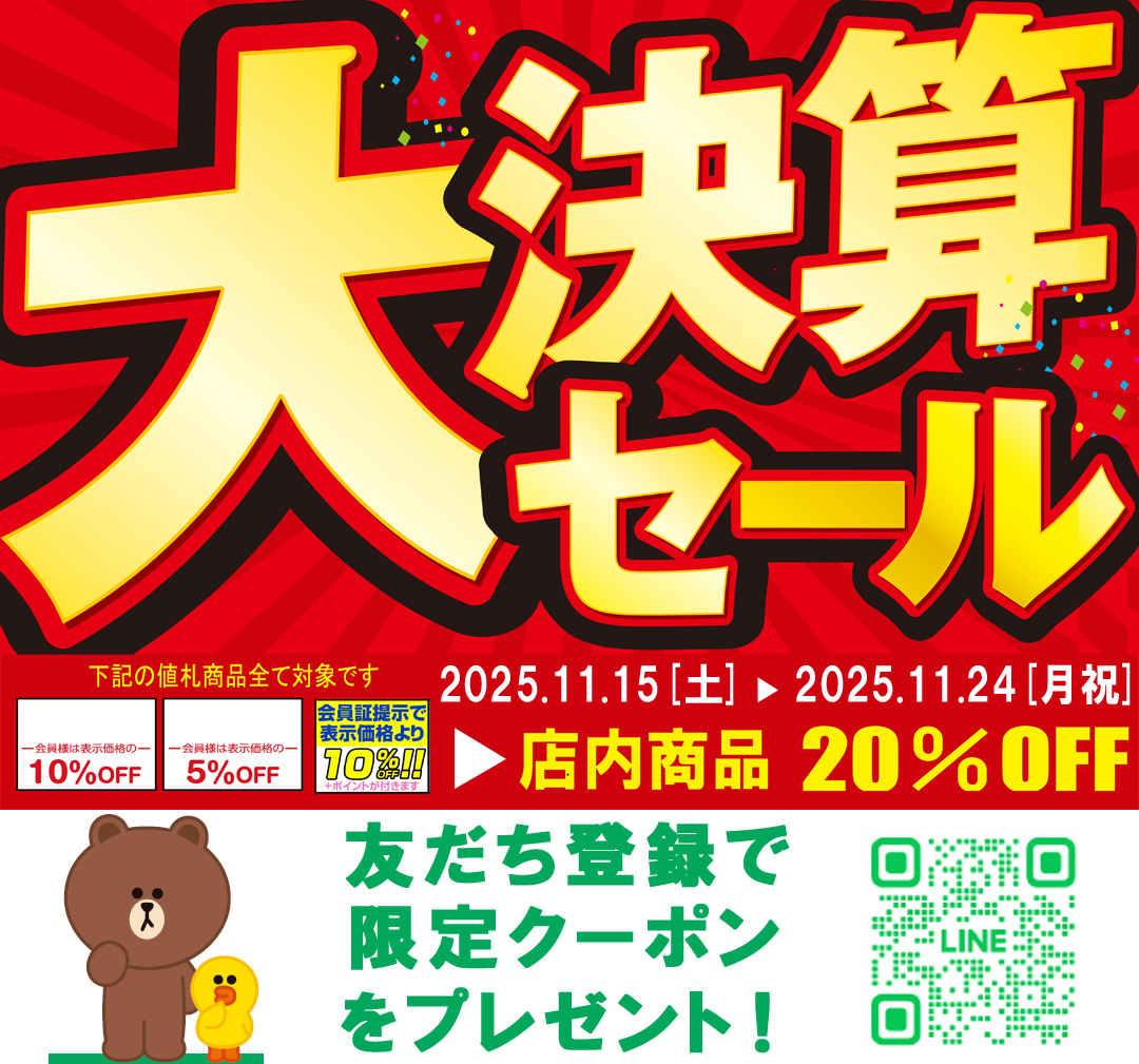 《泉大津店・堺店・大東店》 スポサク「大決算セール」開催! 店内対象商品が20%OFF!! 期間:11/15(土)~11/24(月)