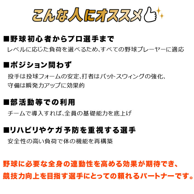 パワーの向上・体幹の安定性・柔軟性と可動域の向上・全身連動性の強化。